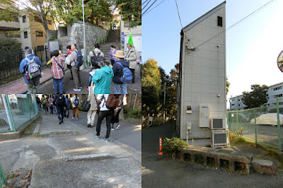 | まち歩きスタート。八芳園の前を下り、玉名川流路跡から玉名池跡。トマソン(上部塗込階段)も有り。 |
