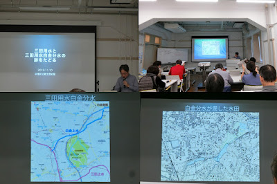 | スタートは都立大学駅。総勢45名くらいで適当に、都立大学駅→柿の木坂支流→駒沢支流→八雲氷川神社→呑川(暗渠)→八畑弁財天→九品仏川→呑川合流点→清水窪弁財天→大岡山駅→清水窪流れ→狢窪流れ→長原流れ→洗足池弁財天→ゴールの千束八幡神社へと歩きます。 |