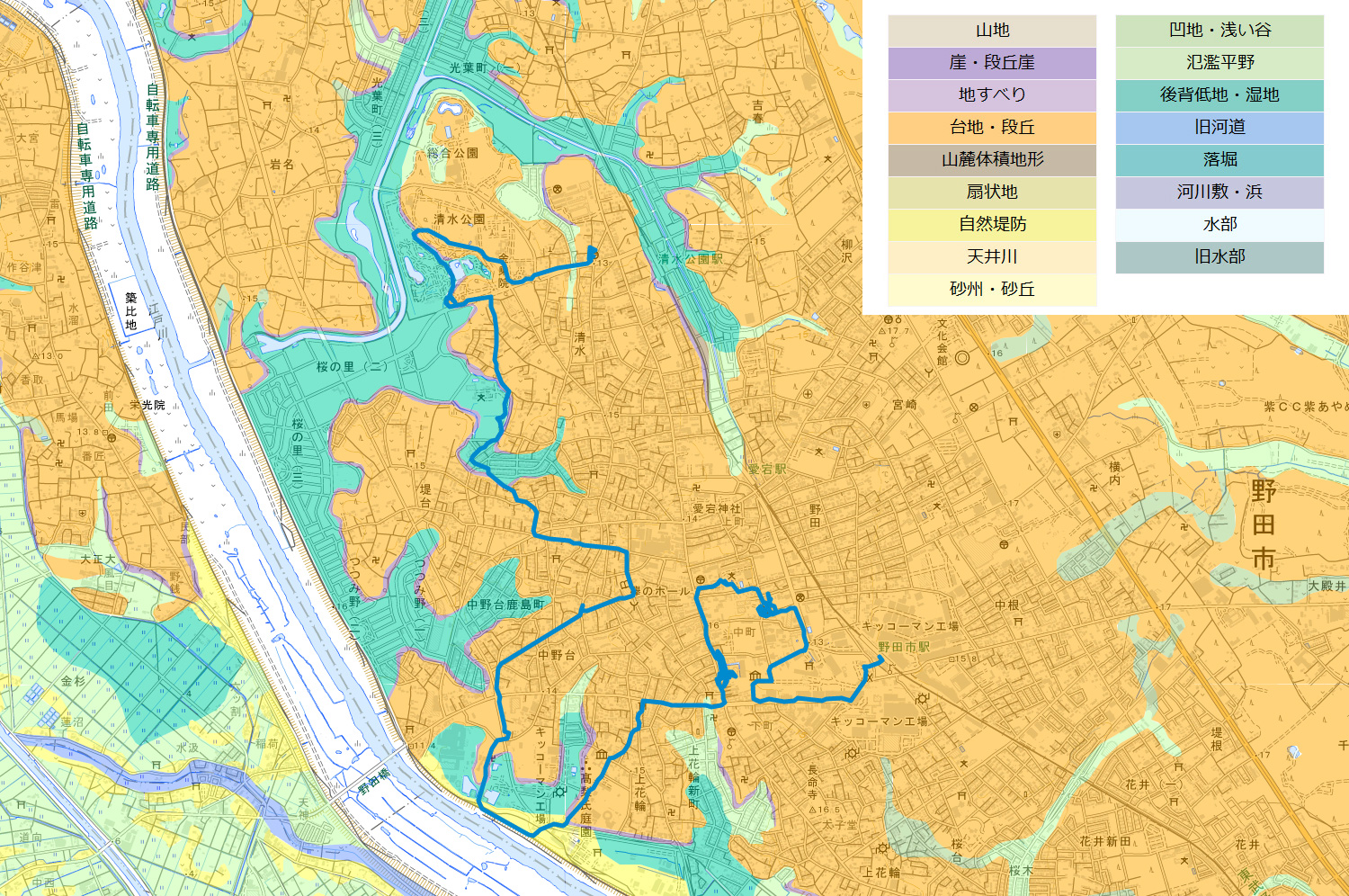 | 土地の成り立ち。桃色:盛土、水色:切土。 |