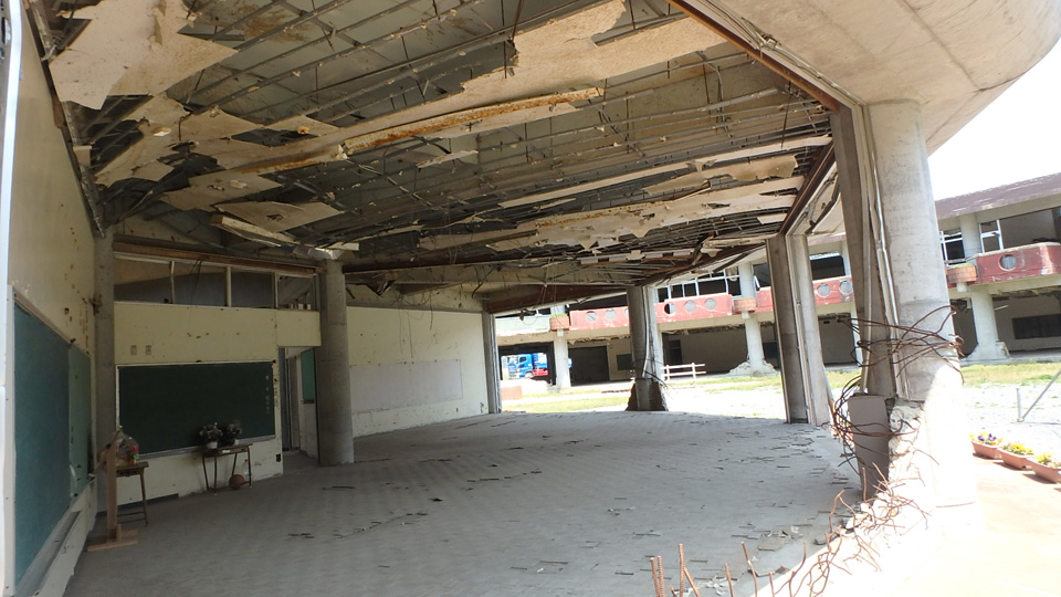 | 岩井崎近く、四階まで津波が達した気仙沼向洋高校(元の水産高校)。教職員、生徒は避難して全員無事。 |